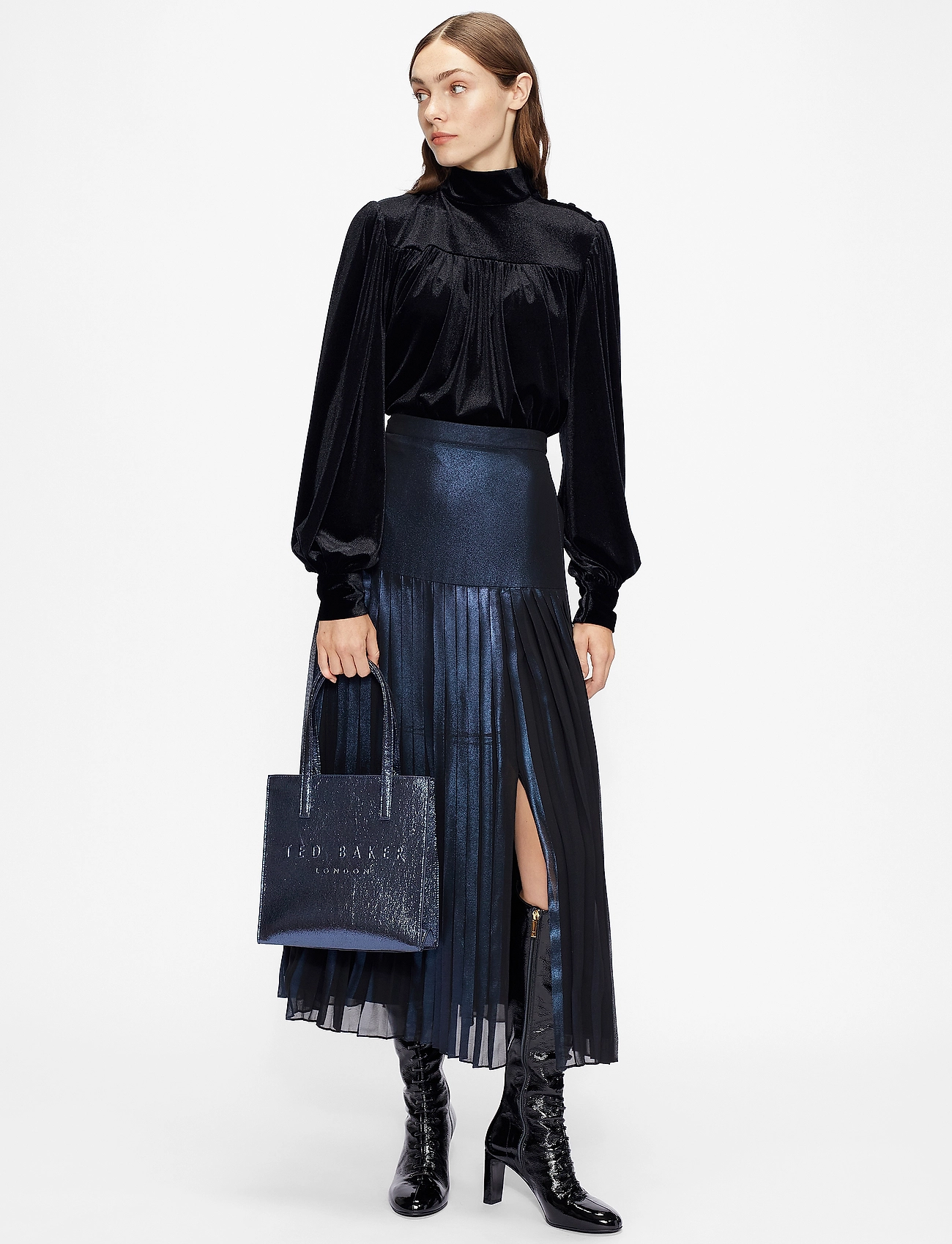 Ted Baker blends a mix of traditional and contemporary influences, his irreverent sense of humor and quintessential British attitude in a collection rich with deep, shadowy hues, intricate prints and finishing flourishes.